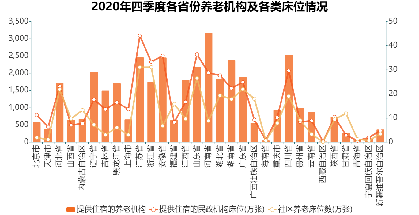 然而機(jī)構(gòu)床位數(shù)上,河南省的偏少,養(yǎng)老床位數(shù)為28.7萬(wàn)張。江蘇仍是我國(guó)的養(yǎng)老大省,機(jī)構(gòu)床位數(shù)達(dá)到了44.1萬(wàn)張。