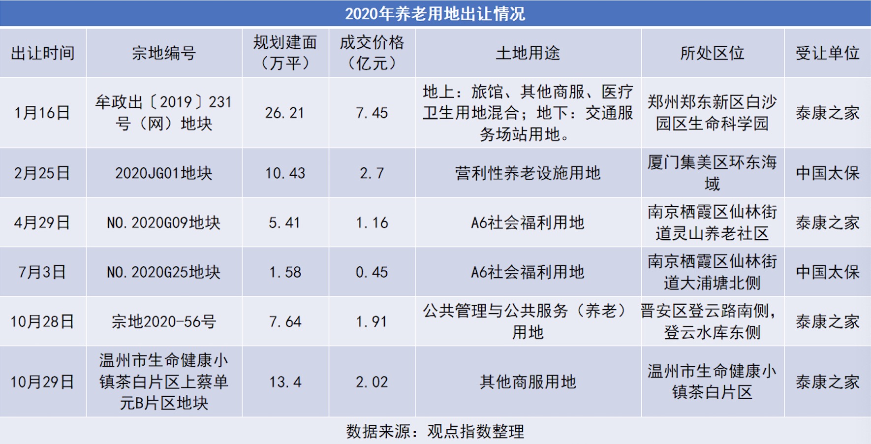 首先在土地市場(chǎng)上,觀點(diǎn)指數(shù)持續(xù)跟蹤國(guó)內(nèi)的養(yǎng)老用地出讓狀況,不完全統(tǒng)計(jì)2020年的6宗養(yǎng)老土地出讓均被泰康之家和中國(guó)太保分食,其中泰康之家收獲4宗,總成交價(jià)12.54億元,規(guī)劃總建面52.66萬(wàn)平方米。