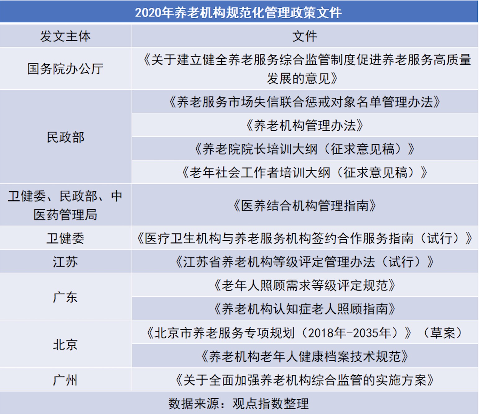 總體來(lái)說(shuō),2020年政策上主要分為三大類,即加強(qiáng)對(duì)養(yǎng)老機(jī)構(gòu)的規(guī)范化管理、持續(xù)鼓勵(lì)民間資本參與養(yǎng)老實(shí)業(yè),以及支持城市更新和老舊小區(qū)改造中配建養(yǎng)老設(shè)施。