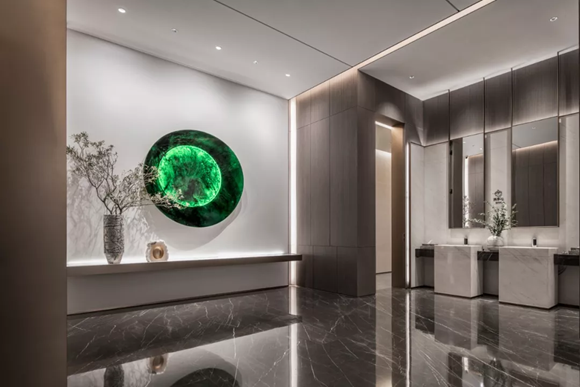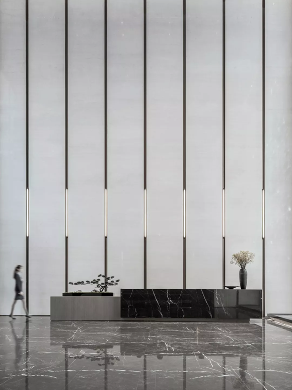 通過(guò)豐富的景觀區(qū)進(jìn)入門廳,感受到空間的空靈,立面設(shè)計(jì)過(guò)濾了來(lái)自于外界的繁復(fù)。十米挑空的大廳,墻面以米色砂巖為基底,黃銅色金屬?gòu)?qiáng)化縱向的比例,凸顯出空間的氣勢(shì)。入口對(duì)景設(shè)置的水景讓穿梭其中的訪客仿若能傾聽(tīng)到潺潺水聲,同時(shí)水景和懸掛的軟裝裝置相得益彰,充滿巧妙的用意,同時(shí)也分隔了挑高通透的玻璃幕墻,虛實(shí)結(jié)合,體現(xiàn)現(xiàn)代設(shè)計(jì)的東方神韻。
