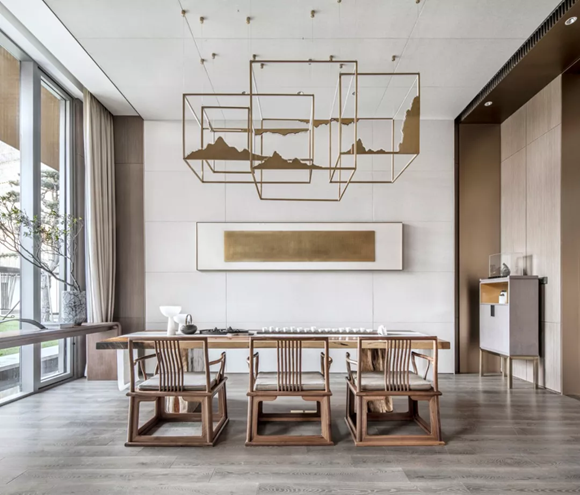 私宴,是以當(dāng)代設(shè)計(jì)來(lái)描繪文人飲酒時(shí)追求的清雅意境,寄情於山水??臻g通過(guò)折疊門和西廚吧臺(tái)區(qū)產(chǎn)生互動(dòng),空間功能既獨(dú)立又有相互滲透。延續(xù)簡(jiǎn)潔流暢的線條,布置與空間密切配合。