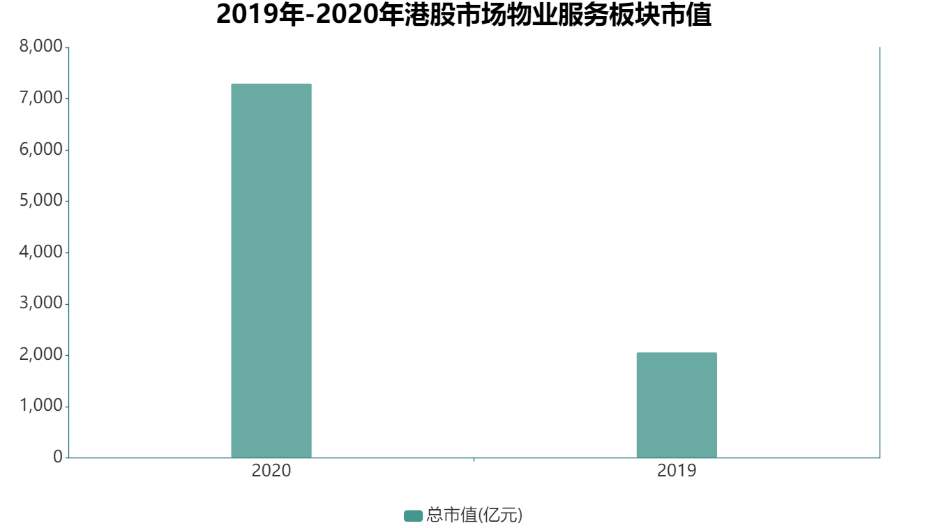 市值表現(xiàn)方面,截至2020年12月31日,38家港股物業(yè)服務(wù)企業(yè)的市值為7301.1億元,而2019年,港股市場物業(yè)板塊總市值僅2062.86億元。