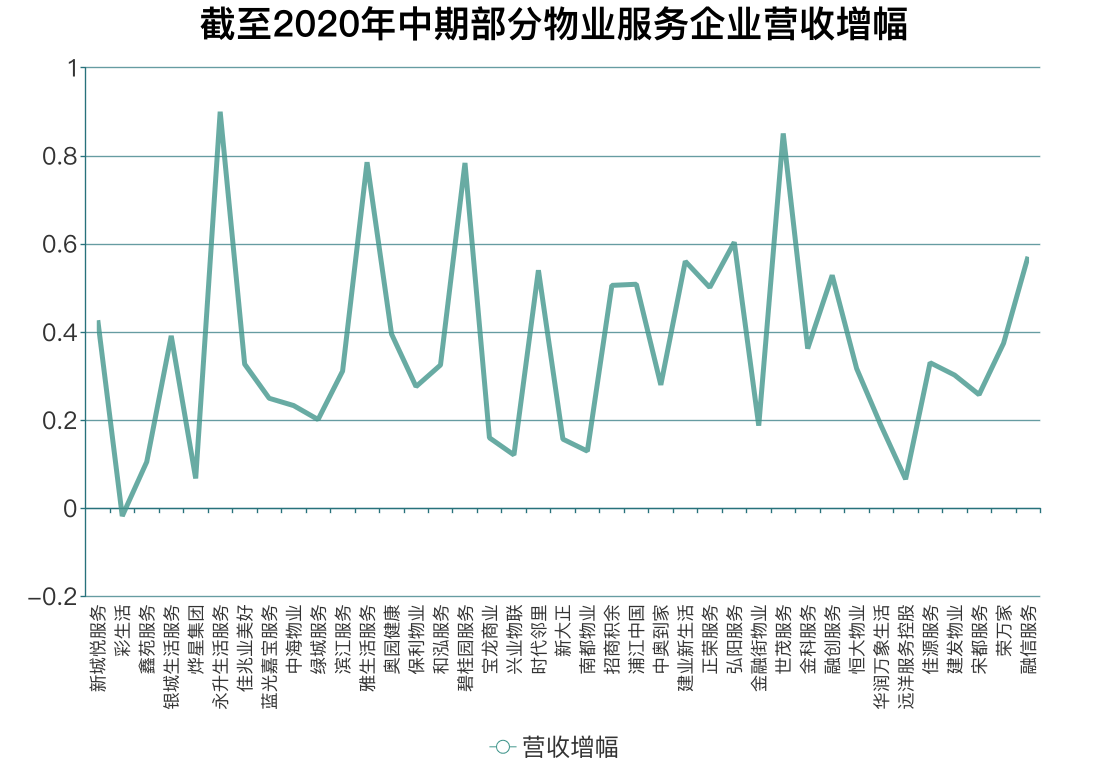 另一方面,市值差異化很大程度上源自部分企業(yè)的營收效益表現(xiàn)帶給資本市場的想空間。從各家港股物業(yè)企業(yè)截至2020年中期數(shù)據(jù)看,38家上市港股物企平均營業(yè)收入增速為33.83%。