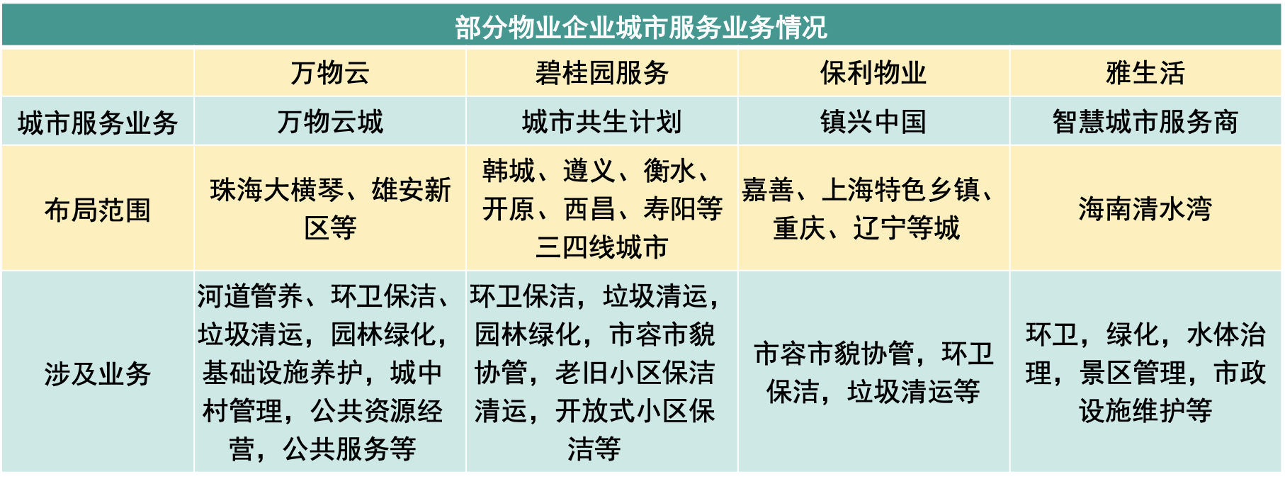 從共性來看,市政環(huán)衛(wèi)是目前頭部物業(yè)企業(yè)試水城市服務(wù)的主要切入點,各個已落地項目的業(yè)務(wù)均有涉及道路清掃、垃圾清運(yùn)、園林綠化養(yǎng)護(hù)等基礎(chǔ)內(nèi)容,可以看作是傳統(tǒng)物業(yè)"四保"服務(wù)場景的延申。