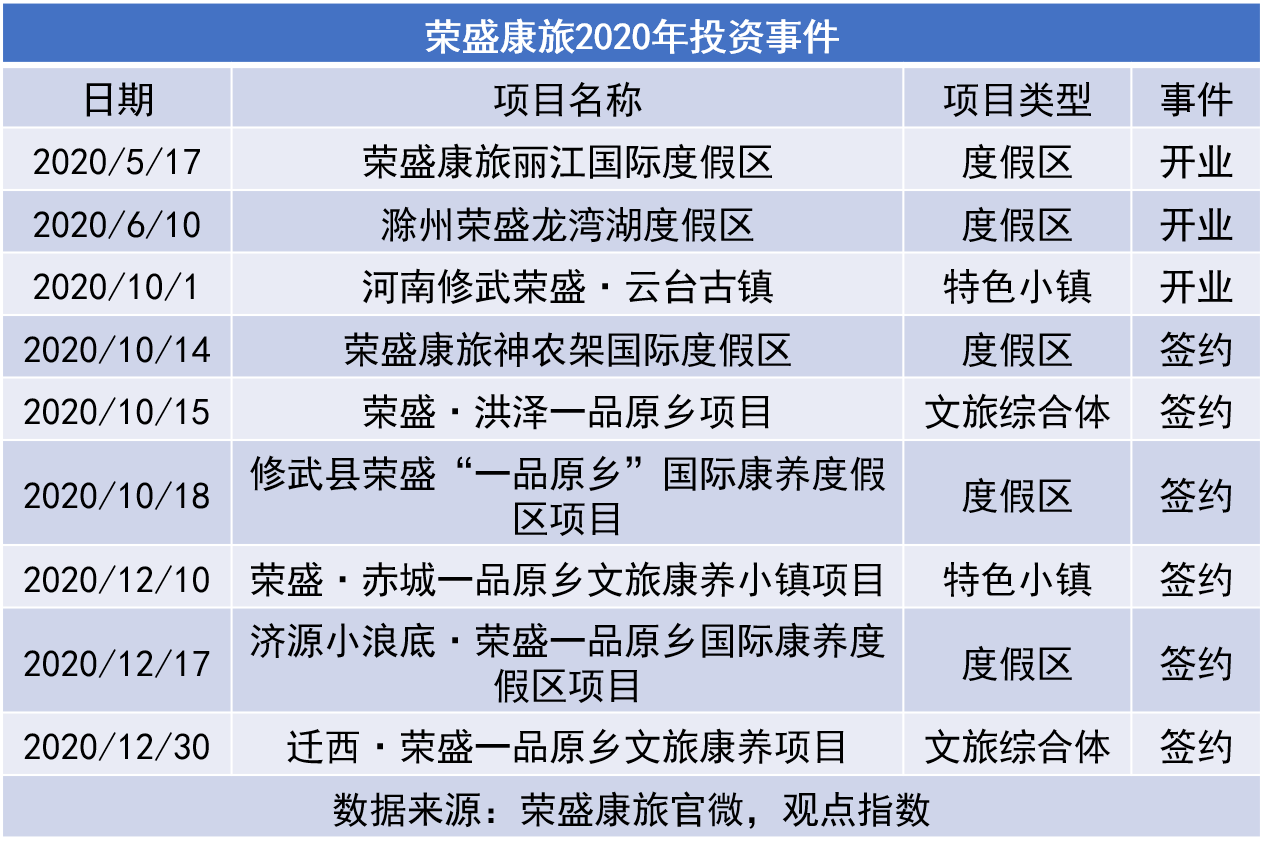 2020年,榮盛康旅有3個項目開業(yè)入市,分別為榮盛康旅麗江國際度假區(qū)、滁州榮盛龍灣湖度假區(qū)和云臺古鎮(zhèn)。另外,年內(nèi)更簽下多個“一品原鄉(xiāng)”項目,該品牌為目前榮盛康旅擴大布局的主力產(chǎn)品線。