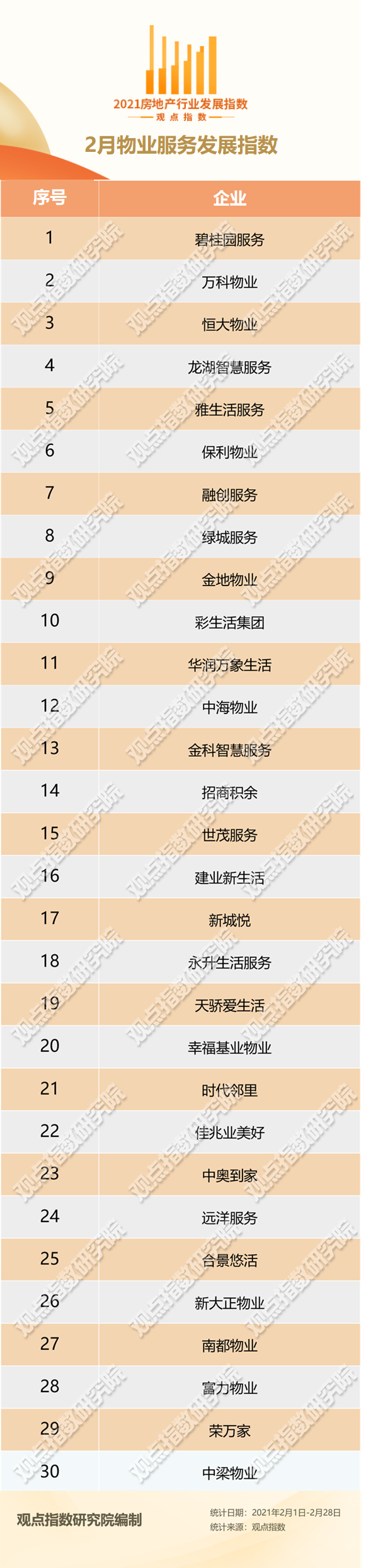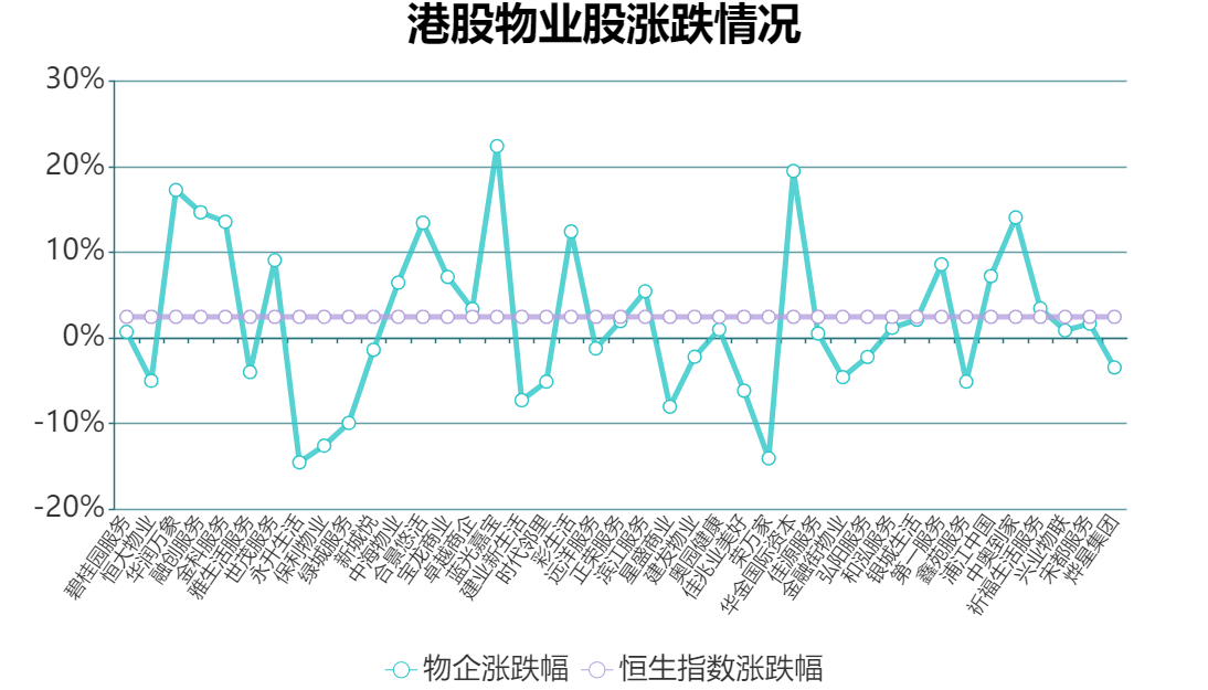 從資本市場角度看,據(jù)觀點(diǎn)指數(shù)監(jiān)測(cè),2月香港恒生指數(shù)漲幅為2.46%,42家已上市港股物業(yè)股中共16家跑贏了該指數(shù)。其中,藍(lán)光嘉寶服務(wù)、華金國際資本以及華潤萬象生活分別以22.41%、19.5%以及17.28%的月內(nèi)漲幅位列前三,物業(yè)板塊的平均漲幅為1.98%。