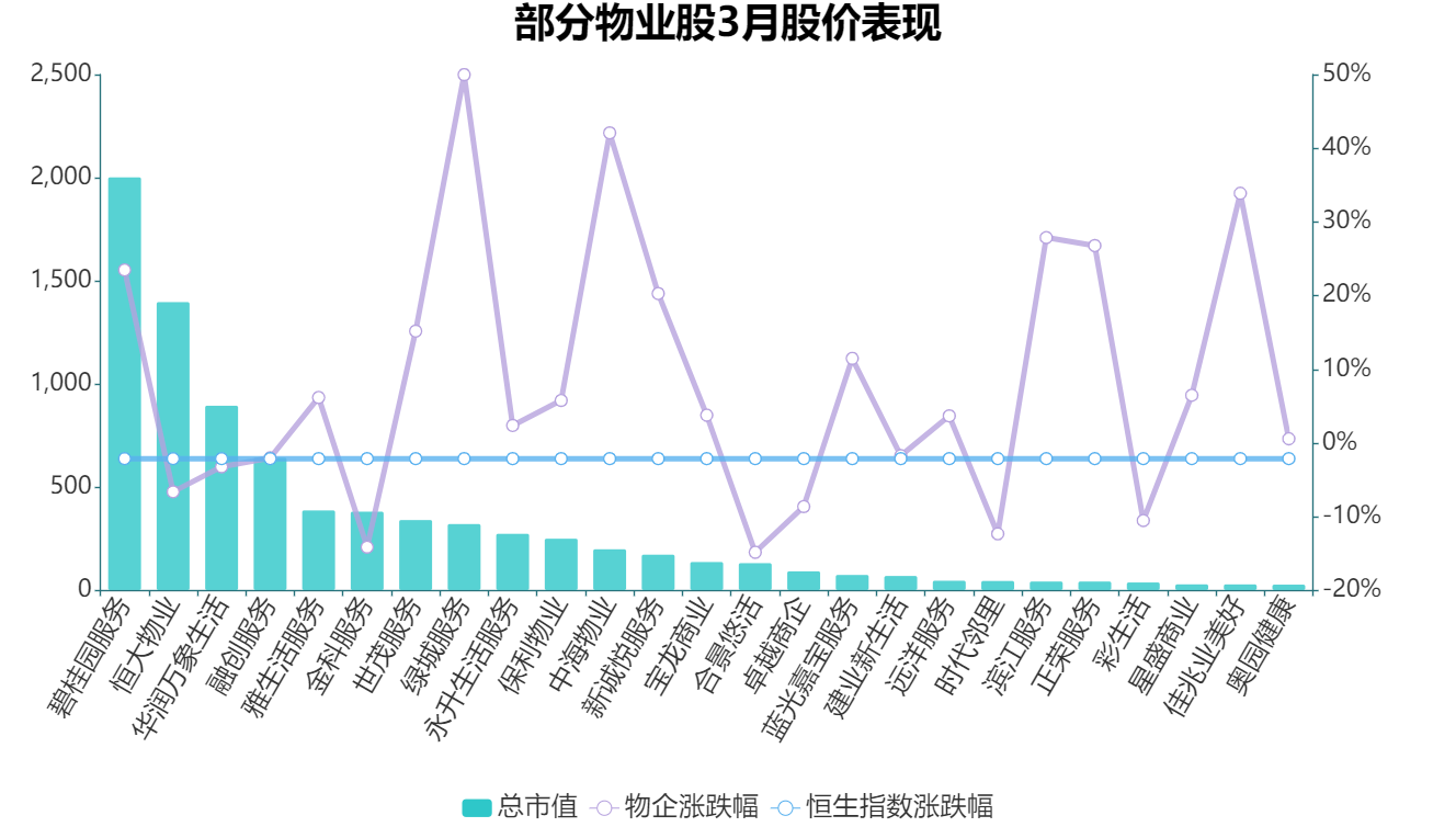 根據(jù)觀點(diǎn)指數(shù)監(jiān)測(cè),25只樣本股票中,漲幅最高的綠城服務(wù)月內(nèi)上漲達(dá)50%,18只物業(yè)股市值加權(quán)的平均漲幅為8.3%,跑贏同期香港恒生指數(shù)10.5個(gè)百分點(diǎn),本月物業(yè)板塊整體依舊維持著高增長(zhǎng)的態(tài)勢(shì)。
