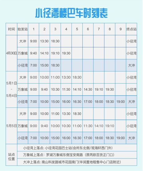 備注:僅為2021.5.1-2021.5.5樓巴車時刻表,具體更新調整請關注華潤小徑灣微信公眾號,了解最新樓巴車信息。