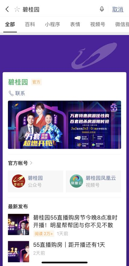 除作為日常營銷入口外,“搜一搜”也是事件營銷和交易的入口,用戶可以在此方便地跳轉(zhuǎn)至碧桂園官方視頻號觀看短視頻和直播,或者跳轉(zhuǎn)至“碧桂園鳳凰云”微信小程序預(yù)約看房、下單買房。據(jù)了解,僅在5月5日當(dāng)天,微信平臺用戶搜索碧桂園的次數(shù)就高達35萬,點擊次數(shù)超21.8萬,整體點擊率超62%,體現(xiàn)出良好的導(dǎo)流效果。