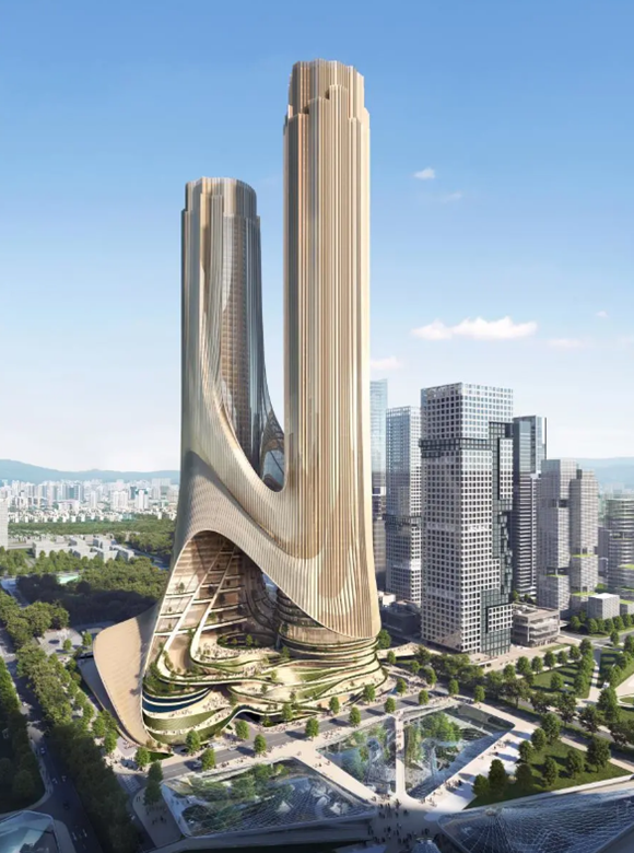 超級總部基地空間結(jié)構(gòu)為“一心雙核,十字生境”,將山脈水景與充滿活力的城市融為一體,C塔項目即位于“超級十字”縱橫交匯處,是片區(qū)“深灣都市核心”3個超高層地標之一,未來將與A塔與B塔共同構(gòu)建深超總天際線形象。項目占地面積約3.6萬㎡,總建筑面積達50萬㎡,其中地上計容面積44萬㎡,規(guī)劃雙塔布局,建筑高度約395米,定位為集辦公、商業(yè)、酒店、文化、交通市政、公共服務(wù)等功能于一體的企業(yè)總部、國際組織和機構(gòu)服務(wù)平臺。項目地下交匯多條城市及城際軌道線路,與地面建筑及交通設(shè)施共同形成片區(qū)雙塔超高層地標TOD綜合體,為片區(qū)提供多方位的公共配套服務(wù)。
