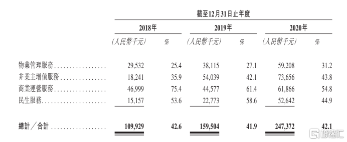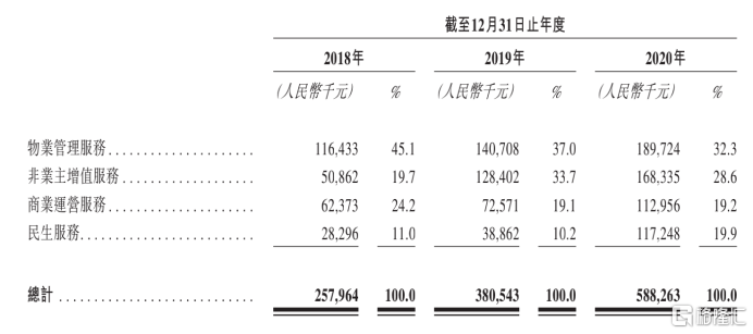 截至2020年12月31日,公司四大業(yè)務(wù)收入占比分別為32.3%、28.6%、19.2%及19.9%。從招股書摘錄的下圖可見,近三年的分部業(yè)務(wù)收入占比有顯著提升的只有兩個板塊,分部是非業(yè)主增值服務(wù)業(yè)務(wù),以及民生服務(wù)業(yè)務(wù),而相比之下,傳統(tǒng)的物管服務(wù)業(yè)務(wù)和商業(yè)運營服務(wù)業(yè)務(wù)的收入占比則有所下降。