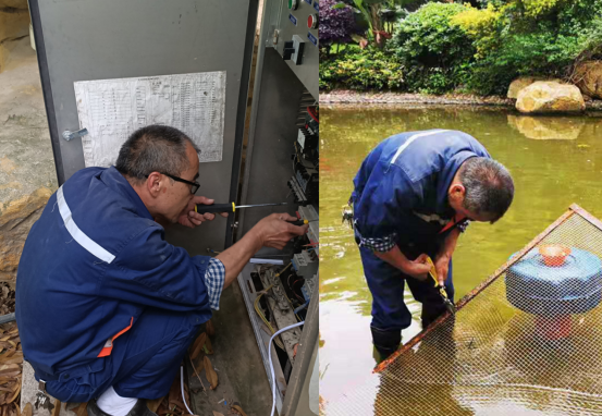 攬江閣工程部王益聯(lián)師傅是個(gè)愛(ài)動(dòng)腦、愛(ài)創(chuàng)造的人。樓頂電梯機(jī)房門(mén)鎖芯受雨水侵蝕經(jīng)常無(wú)法開(kāi)啟,王師傅就利用剩余的空調(diào)門(mén)簾在鎖芯處進(jìn)行覆蓋,用最小的代價(jià)讓問(wèn)題得以解決;園區(qū)景觀水池內(nèi)觀賞魚(yú)有缺氧現(xiàn)象,王師傅發(fā)現(xiàn)問(wèn)題后建議參考公園魚(yú)池增設(shè)增氧泵的做法,從采購(gòu)設(shè)備、線路鋪設(shè)、安裝調(diào)試每一環(huán)節(jié)積極參與,最終問(wèn)題得以解決,魚(yú)兒歡快起來(lái),業(yè)主的心情也更加愉悅起來(lái)。