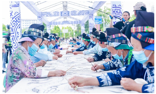 本屆非遺周還一個(gè)重頭活動(dòng)--千人手繪蠟染千鳥(niǎo)圖還等著眾多游客參與。蠟染是丹寨著名的非物質(zhì)文化遺產(chǎn)代表性項(xiàng)目,錦雞又是苗族的吉祥圖騰,非遺周期間,組委會(huì)將組織千人手繪蠟染千鳥(niǎo)圖。游客可以在非遺技藝傳承人的指導(dǎo)下,體驗(yàn)在百米長(zhǎng)卷上繪制蠟染錦雞圖案,在這幅創(chuàng)記錄的蠟染長(zhǎng)卷上留下個(gè)人的手筆。