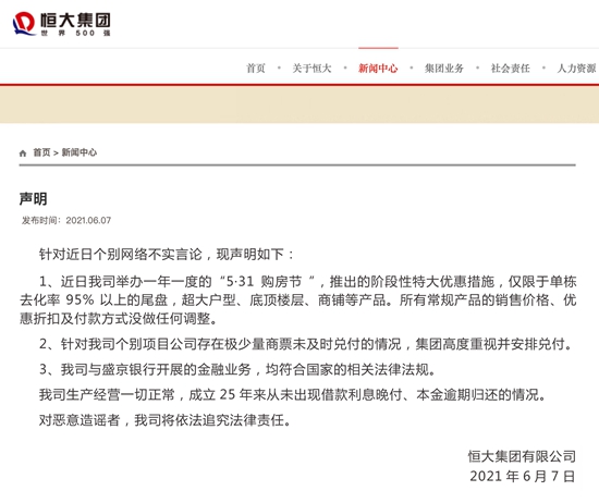 恒大在6月7日發(fā)布聲明,稱公司生產(chǎn)經(jīng)營一切正常,對惡意造謠者,將依法追究法律責(zé)任。