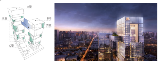 首先,“魔方”中營造了更多的開放空間和微型公園,使樓房像是從“綠盒”森林中長出。