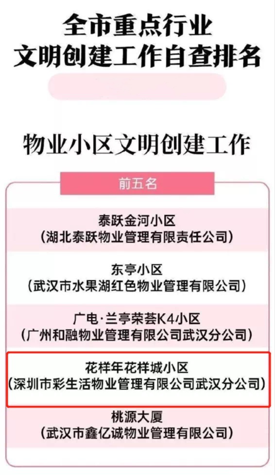 近期,武漢市文明辦會(huì)同相關(guān)行業(yè)主管部門開展重點(diǎn)領(lǐng)域文明程度指數(shù)測(cè)評(píng)排名,深圳市彩生活物業(yè)管理有限公司武漢分公司服務(wù)的花樣年花樣城項(xiàng)目入選武漢市物業(yè)小區(qū)文明創(chuàng)建工作前五名。