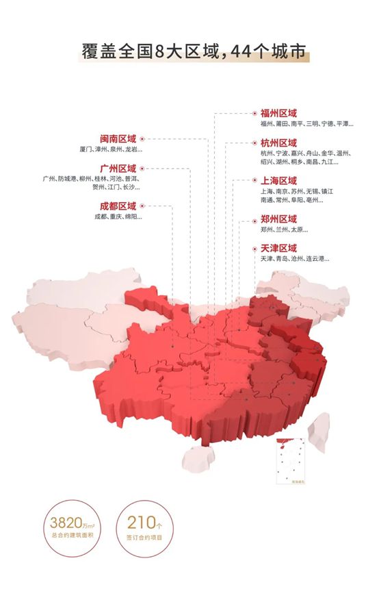 融信服務(wù)以"深耕城市,區(qū)域運(yùn)營(yíng)"為核心,全國(guó)化戰(zhàn)略布局,重點(diǎn)深耕海西經(jīng)濟(jì)圈、長(zhǎng)三角經(jīng)濟(jì)圈并迅速擴(kuò)展至全國(guó)其他區(qū)域。服務(wù)項(xiàng)目主要分布在福州、閩南、杭州、上海、鄭州、成都、天津、廣州八大區(qū)域的40余個(gè)城市。
