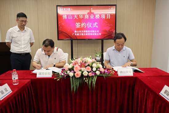 周松董事長代表廣東建方房屋租賃管理有限公司與李耀榮董事長代表佛山市天華投資有限公司正式簽約。