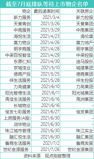 此外,魯商生活服務(wù)與世紀(jì)金源服務(wù)分別于7月2日及26日赴港遞交了招股書(shū),其中后者為招股書(shū)過(guò)期后的二度遞表;截至7月底,港交所目前共有22家物企排隊(duì)等待上市,A股則僅有上房服務(wù)一家。