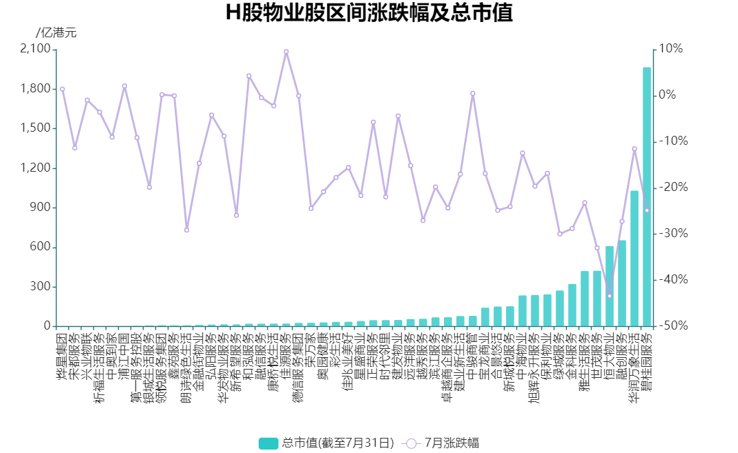 資本市場(chǎng)上,7月份H股物業(yè)股下挫明顯,僅佳源服務(wù)累計(jì)漲幅較高,為9.56%,大部分物業(yè)股包括龍頭在內(nèi)均有不同程度的下跌,市值蒸發(fā)逾千億。