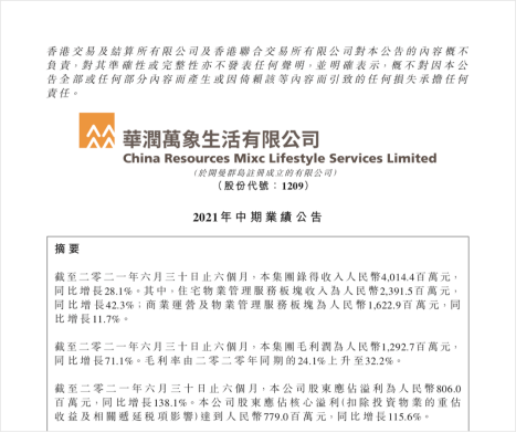 華潤萬象生活2021半年報(bào)發(fā)布:核心凈利潤大幅增長115.6%