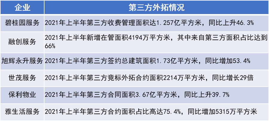 從財報上看,2021年上半年,上市物業(yè)服務(wù)企業(yè)規(guī)模增長顯著,其中第三方外拓面積增長迅速,第三方外拓既滿足增長需要,同時拓展成本遠低于收并購、整合難度較小,可實現(xiàn)擴張-強化-再擴張的良性循環(huán)。