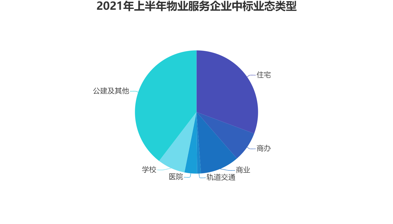 觀點指數(shù)整理上半年近500個中標案例,可以看到物業(yè)企業(yè)的標的項目已呈現(xiàn)多業(yè)態(tài)布局。具體占比為,住宅30.69%、商業(yè)物業(yè)10.23%、商辦物業(yè)7.92%、醫(yī)院物業(yè)3.3%、學校物業(yè)7.26%、公建及其他39.6%、軌道交通0.99%。