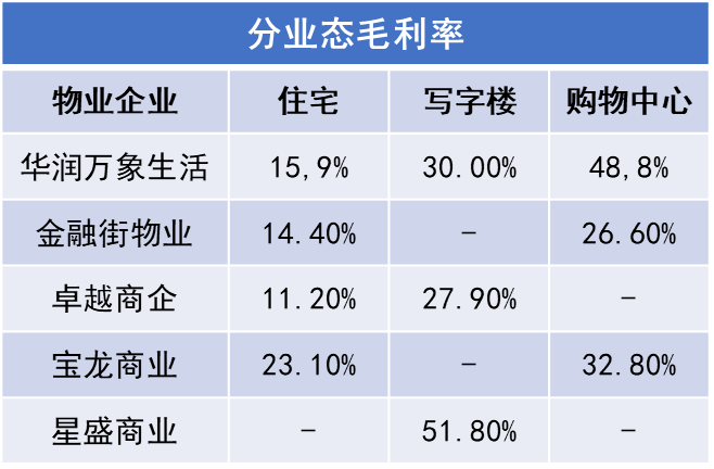 具體到細分業(yè)態(tài)的毛利率上更為直接,同一物業(yè)企業(yè)的商業(yè)物業(yè)毛利率普遍大幅高于住宅物業(yè)。