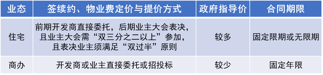 傳統(tǒng)住宅物業(yè)面對的服務(wù)對象通常是復數(shù)的業(yè)主,服務(wù)的空間主要是公共區(qū)域,業(yè)主付費意向低,溝通與提價難度高。甚至面臨著合約期滿的續(xù)約難題,而商辦物業(yè)主要面對單一大業(yè)主,提價難度較低。