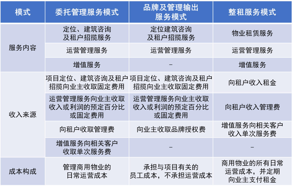 從運營的角度上看,商辦類物業(yè)的運營模式亦各有差異。據(jù)企業(yè)招股書介紹,物業(yè)企業(yè)商辦物業(yè)運營模式主要有三種,即委托管理模式、品牌及管理輸出模式、整租服務(wù)模式。對比來看,當下住宅物業(yè)服務(wù)的模式類似委托管理服務(wù),模式相對單一。