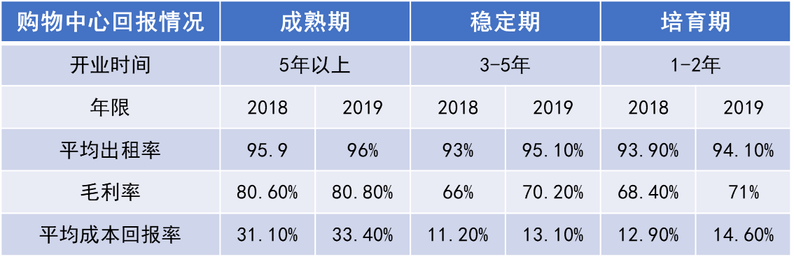 同時,商辦類物業(yè)的盈利水平會隨著項目的發(fā)展而提升,具備較大成長空間。以購物中心為例,單一項目培育期、穩(wěn)定期、成熟期大致為開業(yè)后3年以內(nèi)、開業(yè)3到5年、開業(yè)5年以上。