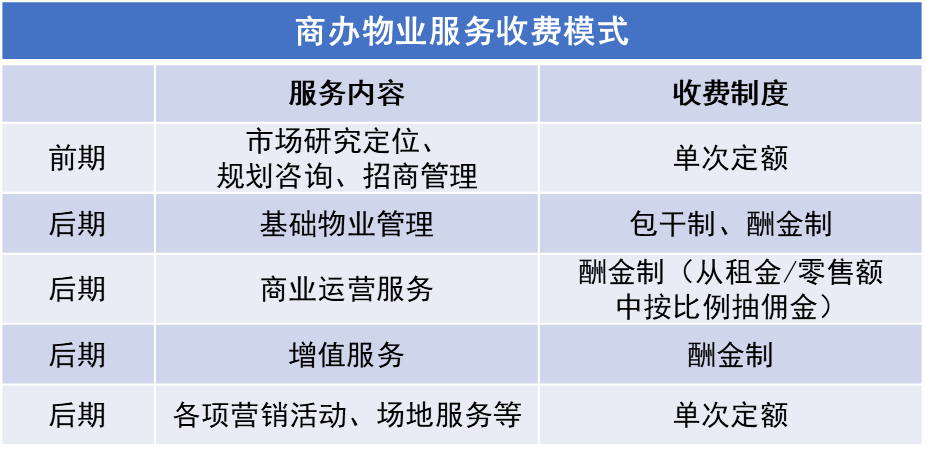 從物業(yè)管理的收費結(jié)構(gòu)來看,與住宅物管類似,商辦物業(yè)可分為多個層次,以“四保一服”為主,疊加各項增值服務(wù);其次還涉及招商及租戶管理等運營服務(wù),以及開業(yè)前期的定位、咨詢,開業(yè)后的活動籌備營銷等。