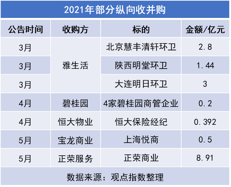 收并購的標的企業(yè)涉及環(huán)衛(wèi)、信息化、保險經(jīng)紀、商管等多元業(yè)態(tài),幫助物業(yè)服務(wù)企業(yè)在城市服務(wù)等領(lǐng)域進行全方位多產(chǎn)業(yè)布局。