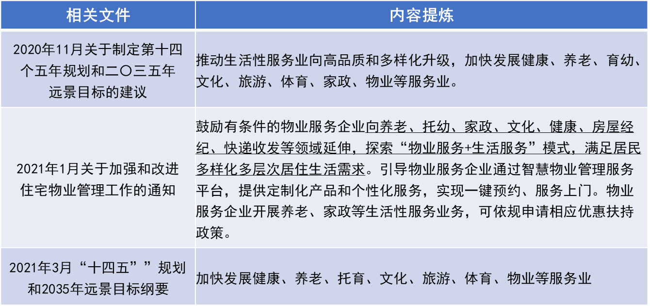 2021年初,住房和城鄉(xiāng)建設(shè)部等十部委聯(lián)合印發(fā)的《關(guān)于加強和改進住宅物業(yè)管理工作的通知》,其中鼓勵有條件的物業(yè)服務(wù)企業(yè),向養(yǎng)老、托幼、家政、文化、健康、房屋經(jīng)紀、快遞收發(fā)等領(lǐng)域延伸。