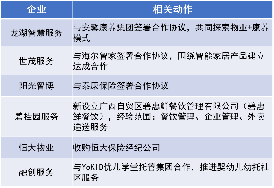 而物業(yè)服務(wù)企業(yè)近期的公開表態(tài)也可以看到,企業(yè)正積極拓展新業(yè)態(tài),拓寬社區(qū)增值服務(wù)來源。如龍湖智慧服務(wù)跨業(yè)態(tài)探索“物業(yè)+養(yǎng)老”;融創(chuàng)服務(wù)入局社區(qū)幼托服務(wù);碧桂園開展團膳業(yè)務(wù)等。
