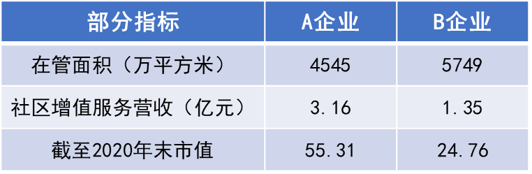 對比2020年A、B兩家上市物業(yè)服務(wù)企業(yè)營收數(shù)據(jù),A企業(yè)在管面積為4545萬平方米,B企業(yè)在管面積為5749萬平方米。盡管規(guī)模小有差距,A企業(yè)2020年社區(qū)增值服務(wù)為3.16億元,B企業(yè)增值服務(wù)營收則僅為1.35億元。