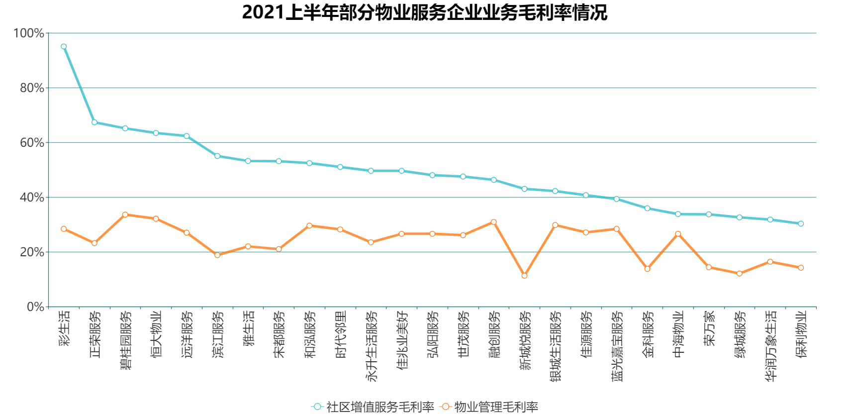 26家樣本物企的基礎(chǔ)物管服務(wù)毛利率在10.6%到34.6%之間,均值為23.72%,而社區(qū)增值服務(wù)毛利率區(qū)間為30.3%-95%之間,均值為48.97%。