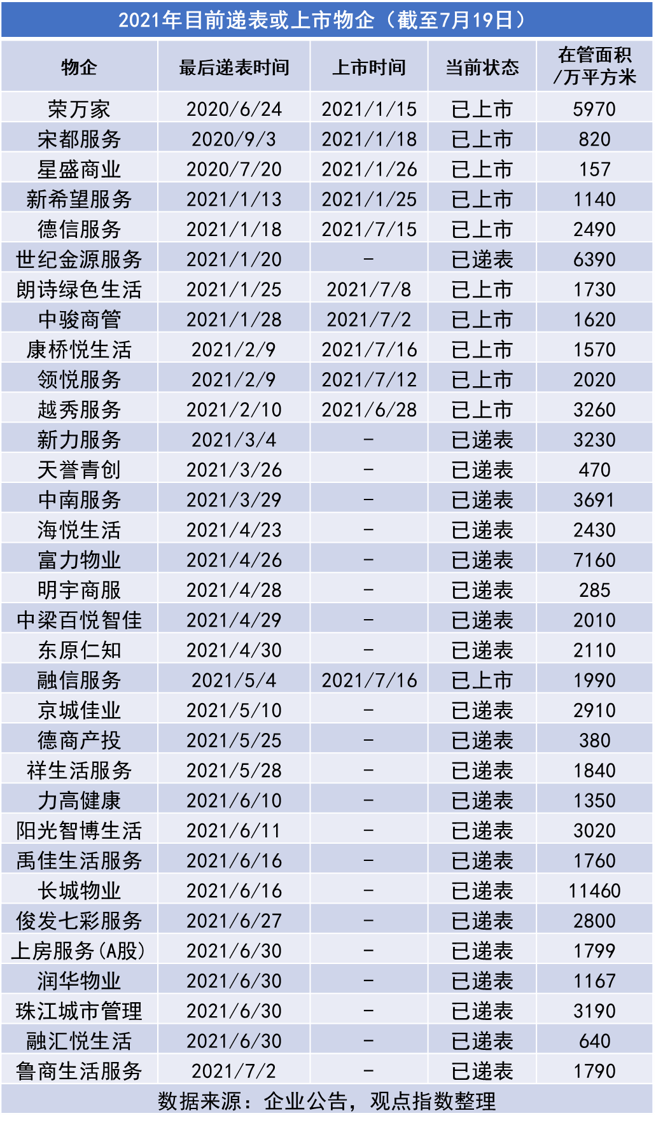2021年年中,物管板塊迎來了一波遞表和上市的小高峰,大量物企集中在此時間段遞表或上市。截至7月19日,今年已共有11家物企順利上市,22家仍處于遞表排隊階段,總和達到33家,數(shù)量上已遠遠超過2020年上市的的18家物企。觀點指數(shù)預計,今年成功上市的物企數(shù)量有望超過30家,屆時資本市場物管板塊的企業(yè)數(shù)量將突破70家。