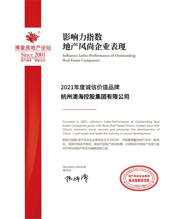 澳海集團(tuán)榮獲地產(chǎn)風(fēng)尚企業(yè)表現(xiàn)2021年度誠信價值品牌