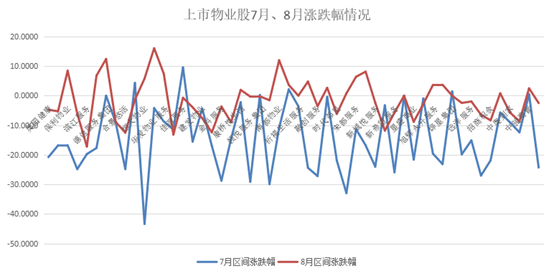 具體到個股,52家上市物企(含鑫苑服務(wù))8月平均跌幅為1.5%,較7月的平均跌幅14.33%有明顯的收窄,或與物業(yè)企業(yè)在中報中披露業(yè)績大幅度增長以及未來增收空間潛力較大有關(guān)。