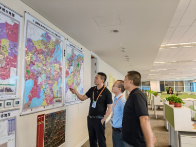 劉劍(左一)和同事在討論項(xiàng)目選址