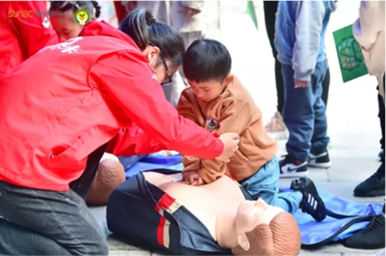 這只是活動十余個體驗區(qū)的其中一角。在這個居住了四萬余戶家庭的大型社區(qū)的廣場上,數(shù)百對家長與孩子正好奇而專注地學習著從急救包扎、火災逃生到溺水救援的各類安全知識和自護技能。