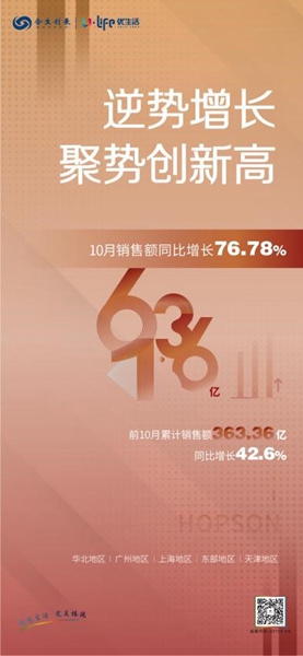 位于廣州的合生o中央城表現(xiàn)也不同凡響,一路熱銷、量價齊升,成為了黃埔區(qū)銷量及口碑俱佳的網(wǎng)紅大盤;杭州的合生創(chuàng)展名邸以全方位數(shù)字推廣,靈活運用線上線下組合營銷路徑,閉環(huán)式推動項目銷售爆點,開盤即實現(xiàn)全盤高達95%去化,為10月銷售業(yè)績做出了突出貢獻;上海昆山的合頌蘭亭、合樾蘭亭、廣州的湖山國際等項目持續(xù)熱銷貢獻現(xiàn)金流。
