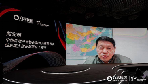 中國房地產業(yè)協(xié)會副會長兼秘書長、住房城鄉(xiāng)建設部原總工程師陳宜明遠程致辭