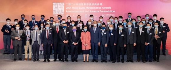 2021年恒隆數(shù)學(xué)獎各得獎隊(duì)伍與香港特別行政區(qū)行政長官林鄭月娥女士、恒隆地產(chǎn)董事長陳啟宗先生、副董事長陳文博先生、行政總裁盧韋柏先生、香港科技大學(xué)校長史維教授,以及2021年恒隆數(shù)學(xué)獎學(xué)術(shù)委員會、督導(dǎo)委員會、執(zhí)行委員會和初審委員會的委員合照