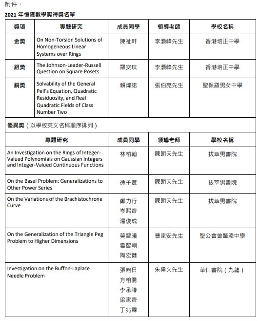 香港培正中學(xué)勇奪2021年恒隆數(shù)學(xué)獎金獎及銀獎殊榮