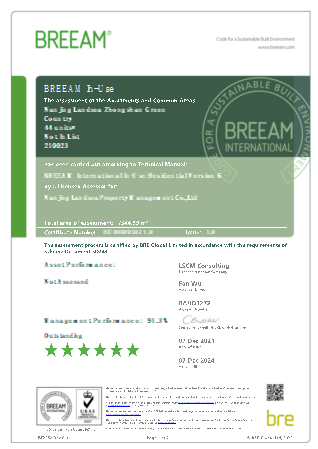 南京朗詩(shī)鐘山綠郡以91.3分獲得全球首個(gè)BREEAM In-Use V6住宅項(xiàng)目6星認(rèn)證,該得分也是截至目前該類評(píng)估的最高分,為住宅的綠色運(yùn)維管理樹立了新的標(biāo)桿。