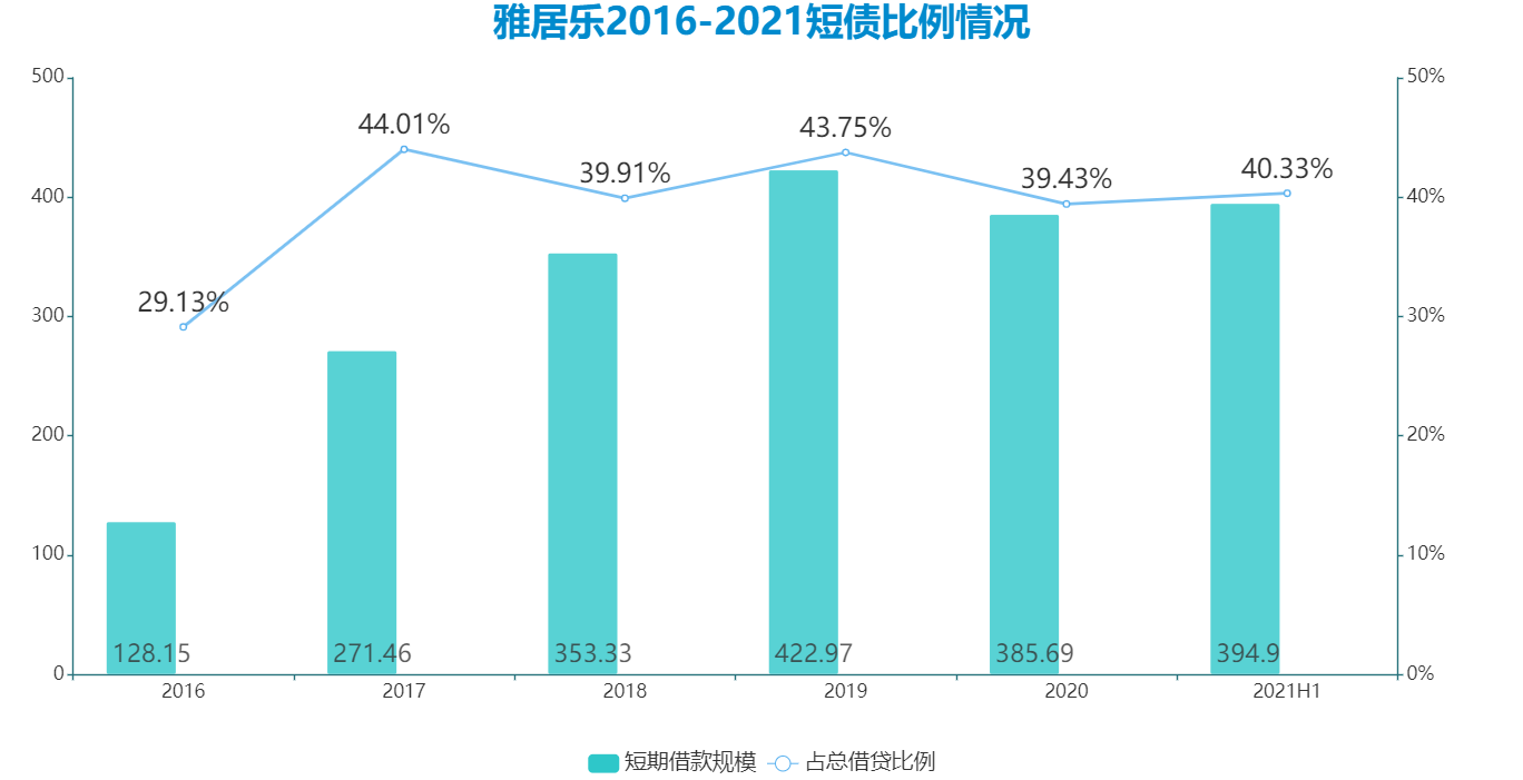 四成的短債比例,使得房企在政策波動、再融資受限時資金鏈過于緊繃,容易產(chǎn)生兌付危機(jī)。可以從圖表中窺見,自2016年至2021年中期,雅居樂短期有息負(fù)債規(guī)模從128.15億元波動上升至394.9億元,占比從29.13%上升到40.33%,中間一度升至44.01%。