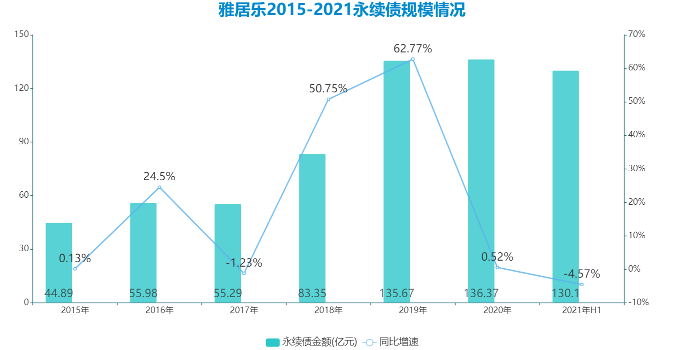 贖回后,截至2021年中期雅居樂永續(xù)債存續(xù)規(guī)模為130.1億元,較2020年底總規(guī)模下降4.57%,但仍保持較大規(guī)模。