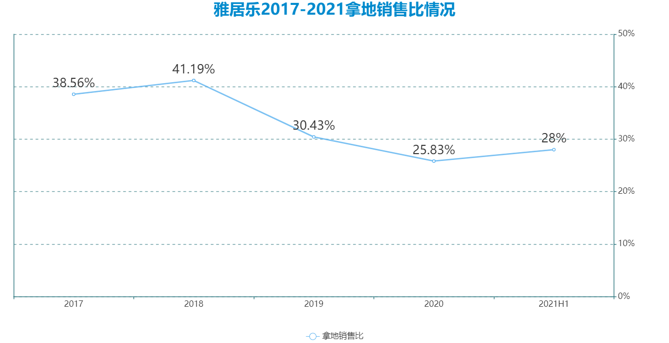 上半年,雅居樂平均土地獲取成本達(dá)7109元/平方米,相比2020年全年的4270元/平方米漲幅迅猛;同時,拿地銷售比指標(biāo)呈現(xiàn)不降反升至28%。不過從下半年拿地情況觀察,雅居樂全年拿地力度預(yù)計呈現(xiàn)下降趨勢。